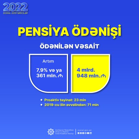 Ötən il pensiya ödənişlərinə əvvəlki ilə nisbətən 361 mln. manat çox olmaqla 4 mlrd. 948 mln. manat yönəldilib